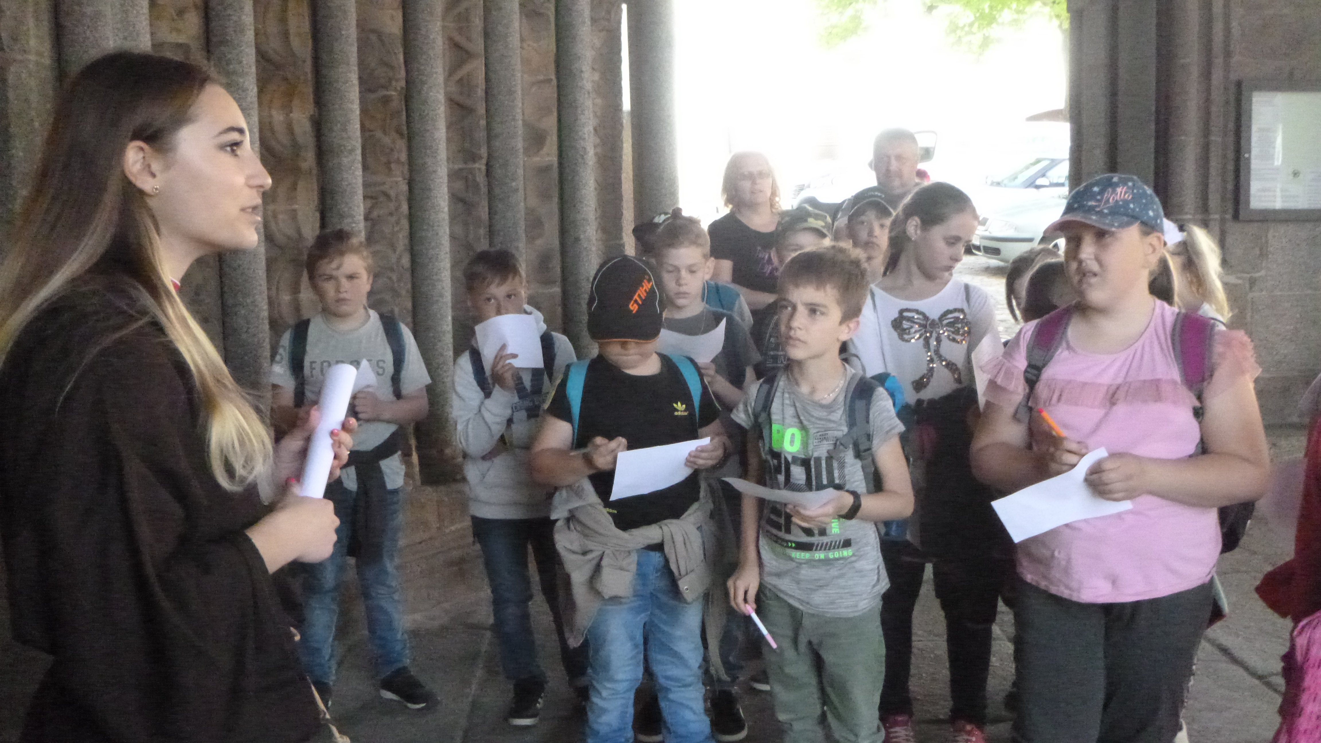 U Baziliky nás přivítala mladá paní průvodkyně, která zrovna ten den skládala maturitní zkoušku. Provedla nás prostorami Baziliky, seznámila nás s její historií a připravila si pro nás kvíz a sladké odměny.