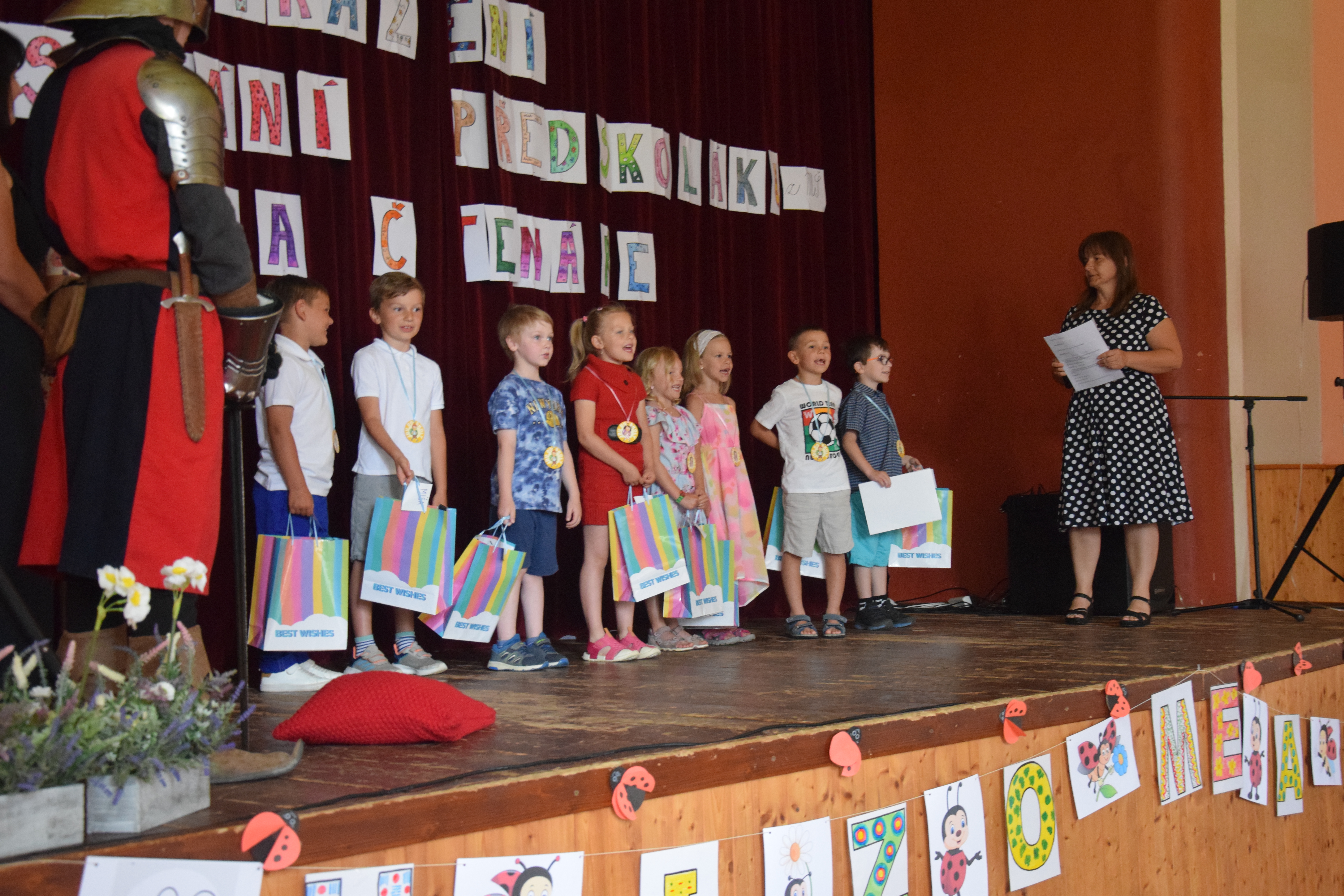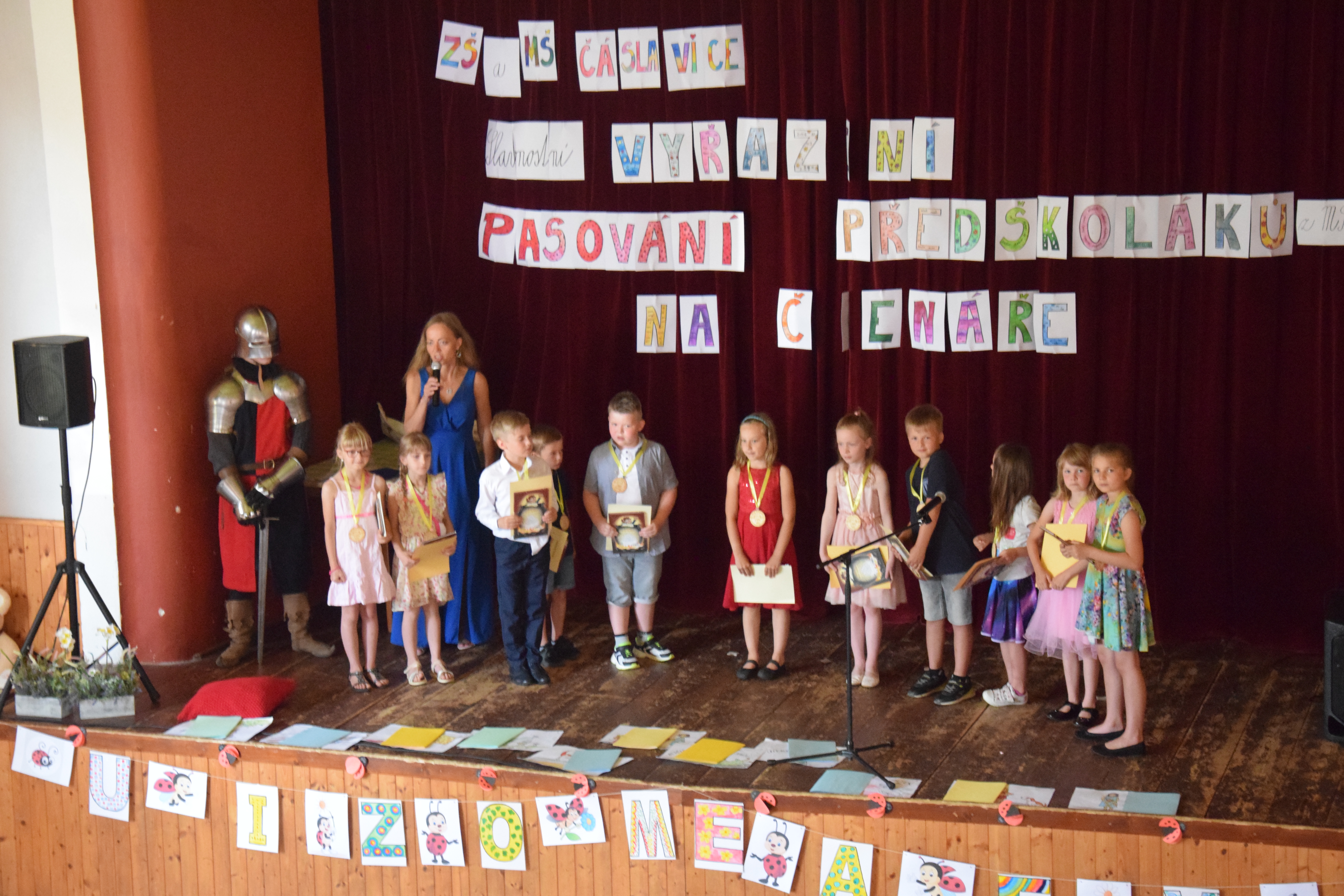Předškoláci byli slavnostně pasováni rytířem na školáky, kteří už od září budou každý den zasedat do školních lavic. Se svými paními učitelkami si pro tuto příležitost připravili pásmo básniček a písniček. Obdrželi pamětní diplom, medaili i drobné dárky. Přejeme jim, aby v září vykročili tou správnou nohou a aby se jim ve škole líbilo.
