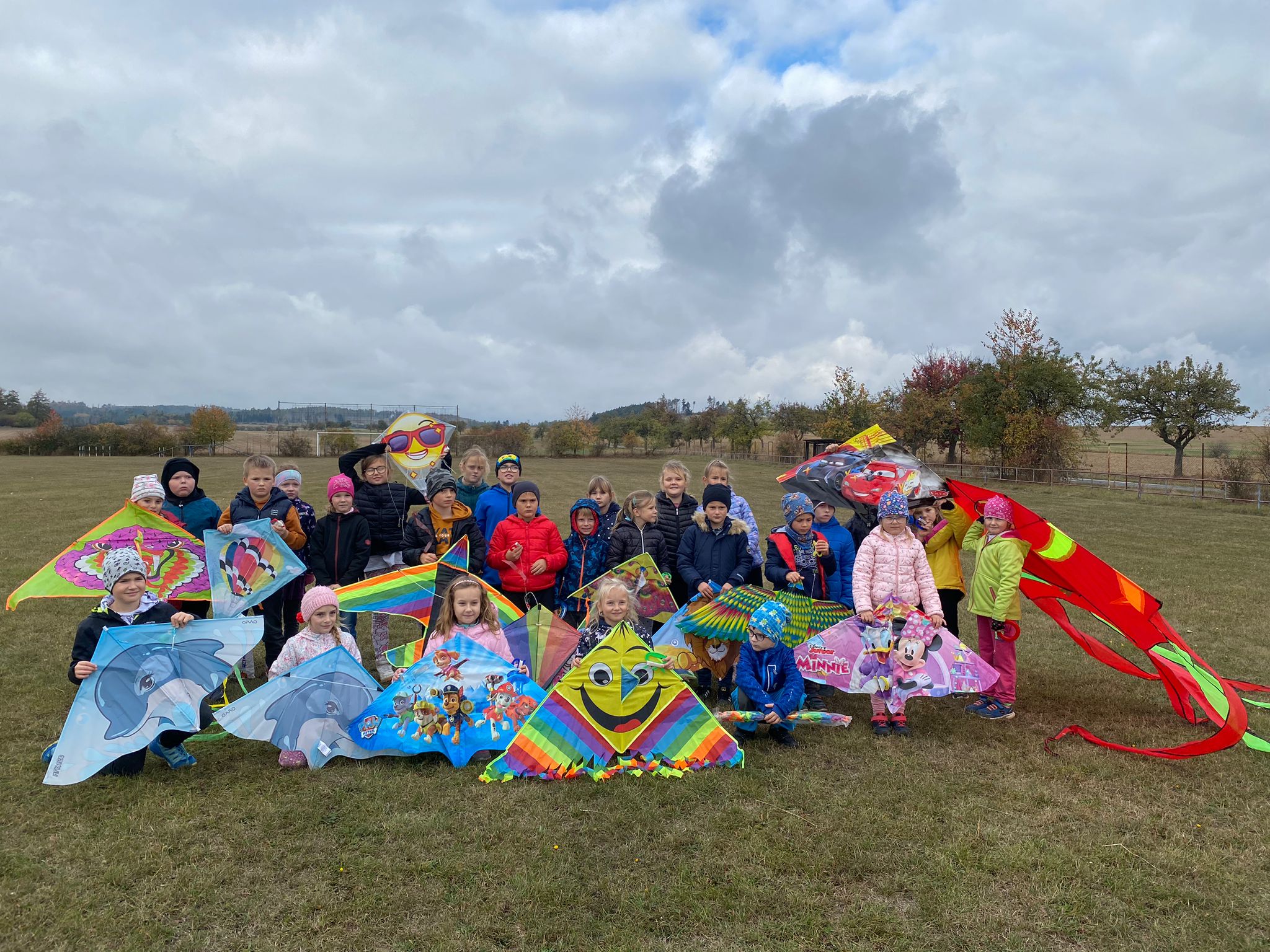 Ve středu 25. října – den před podzimními prázdninami – se žáci 1. až 3. třídy vypravili na staré fotbalové hřiště pouštět draky.