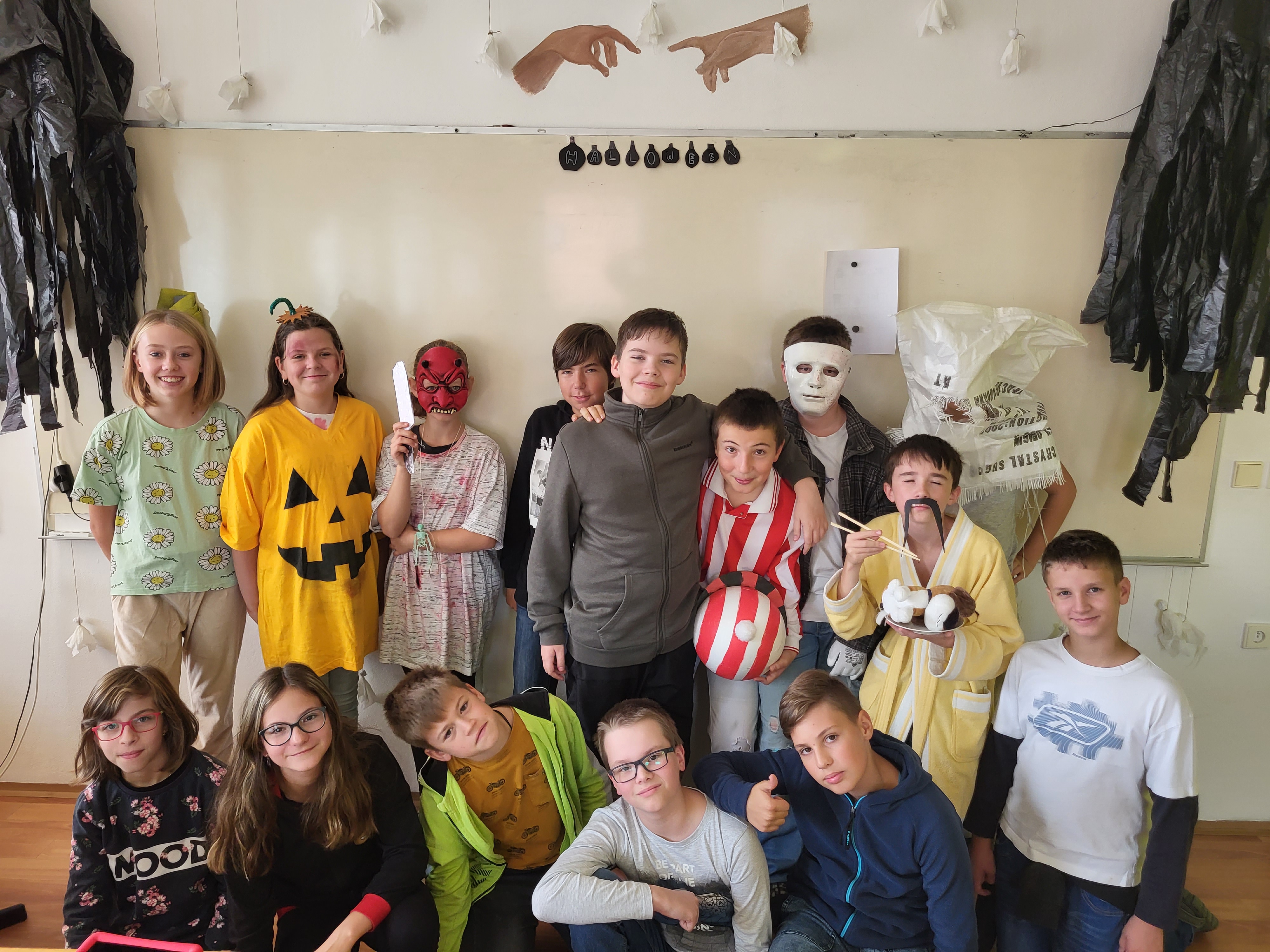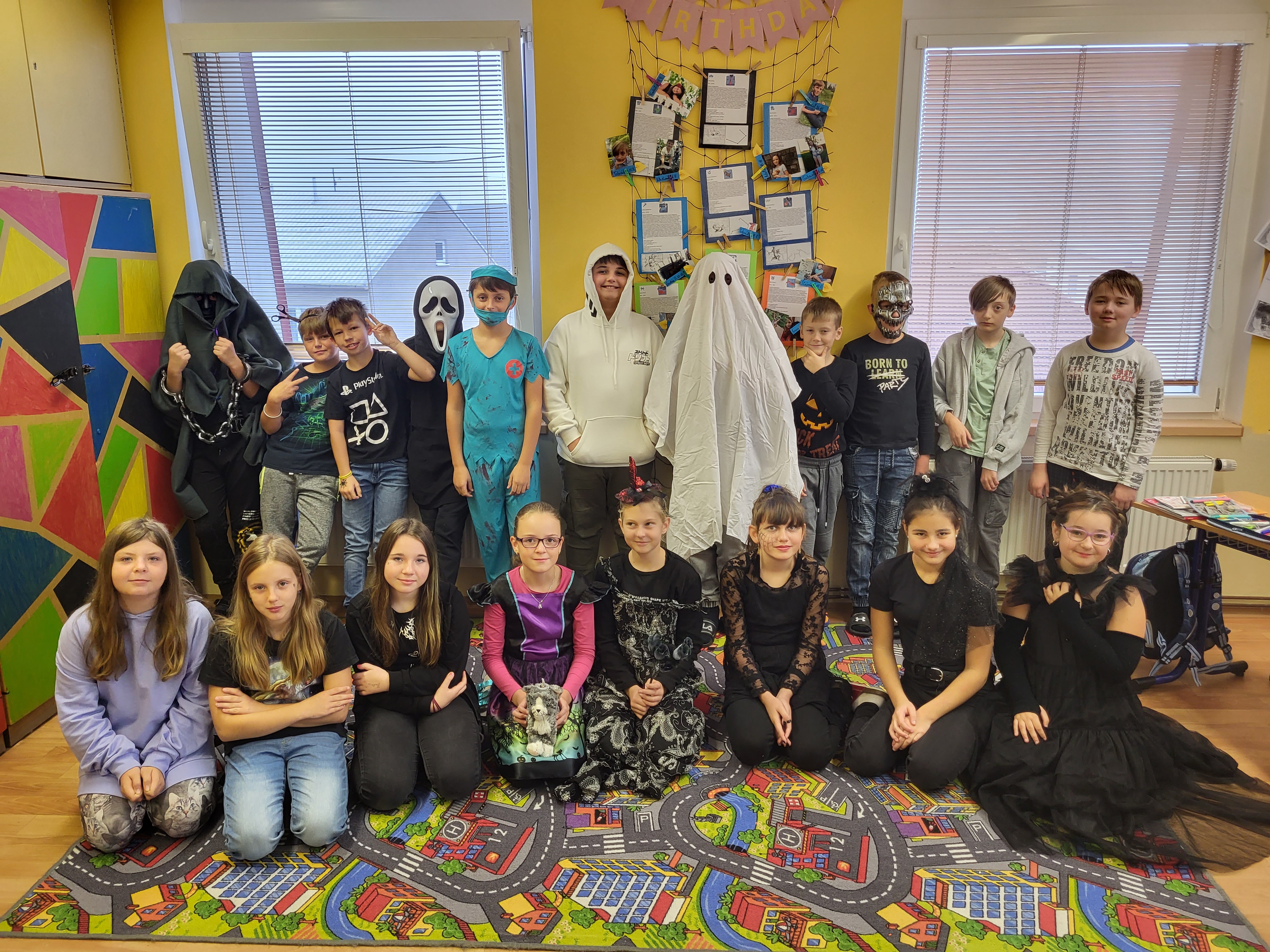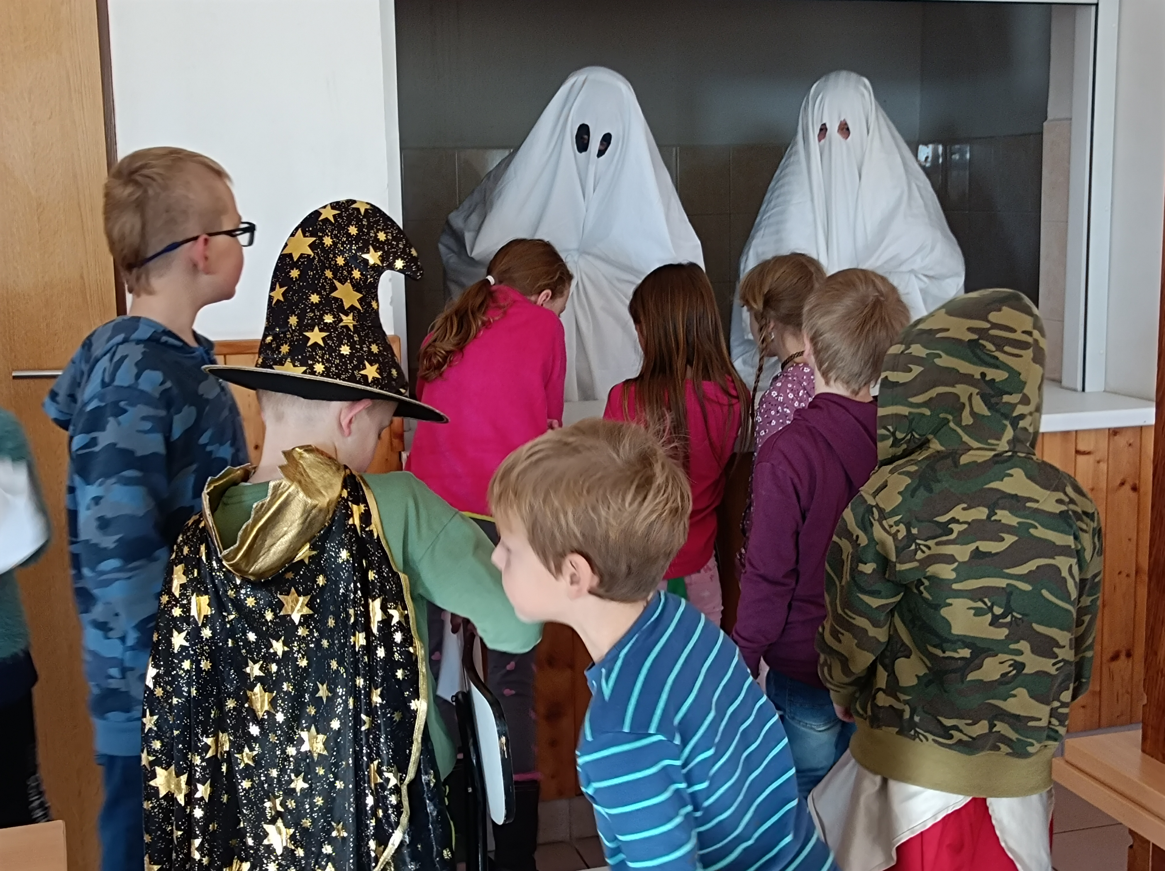 Také v naší škole jsme na tyto svátky nezapomněli, takže jste tu mohli potkat různé duchy a strašidla - skoro celý týden, protože mladší žáci se se svými maskami rozloučit nechtěli ani v jídelně a našli se i tací, kteří přišli každý den v kostýmu jiném. :) Povídali jsme si o předcích, zapalovali svíčky a ve středu si užili Halloweenskou stezku, kterou pro své mladší spolužáky připravili žáci 9. ročníku.