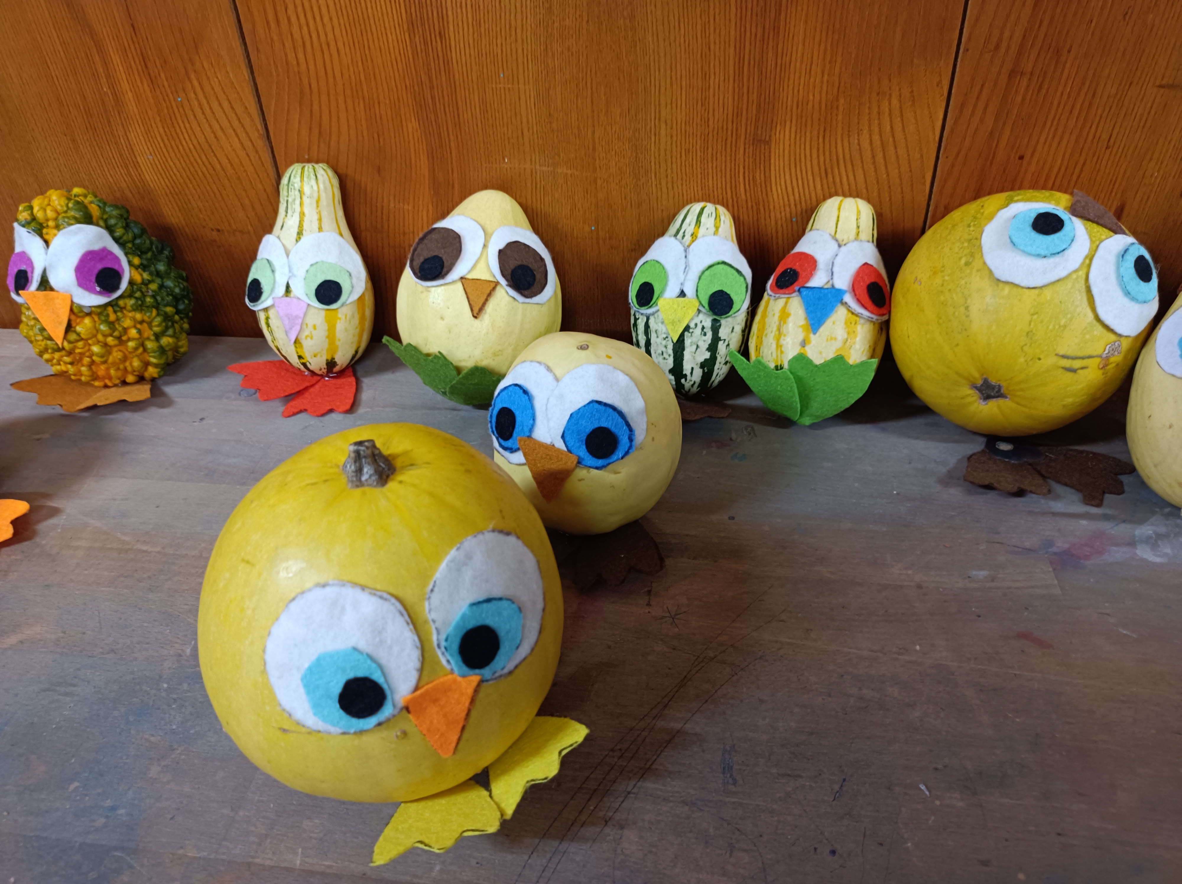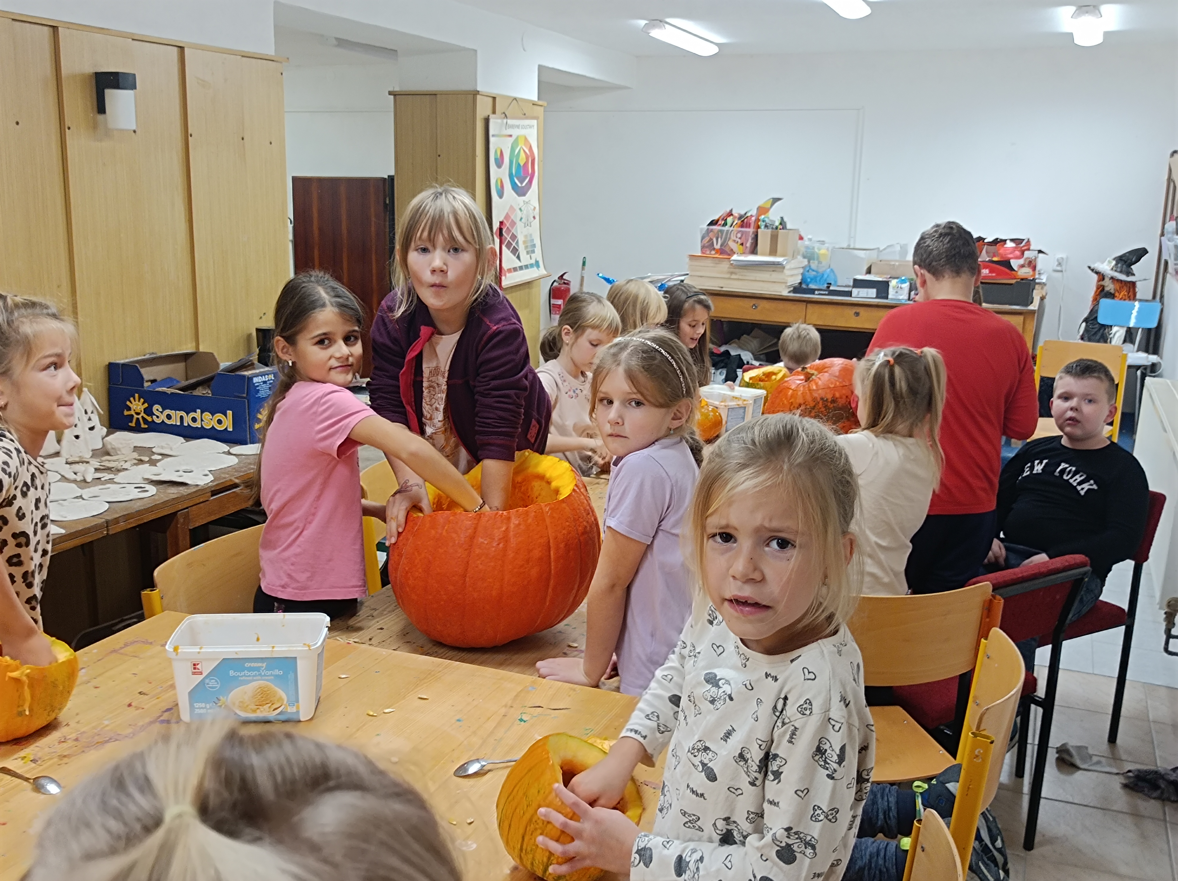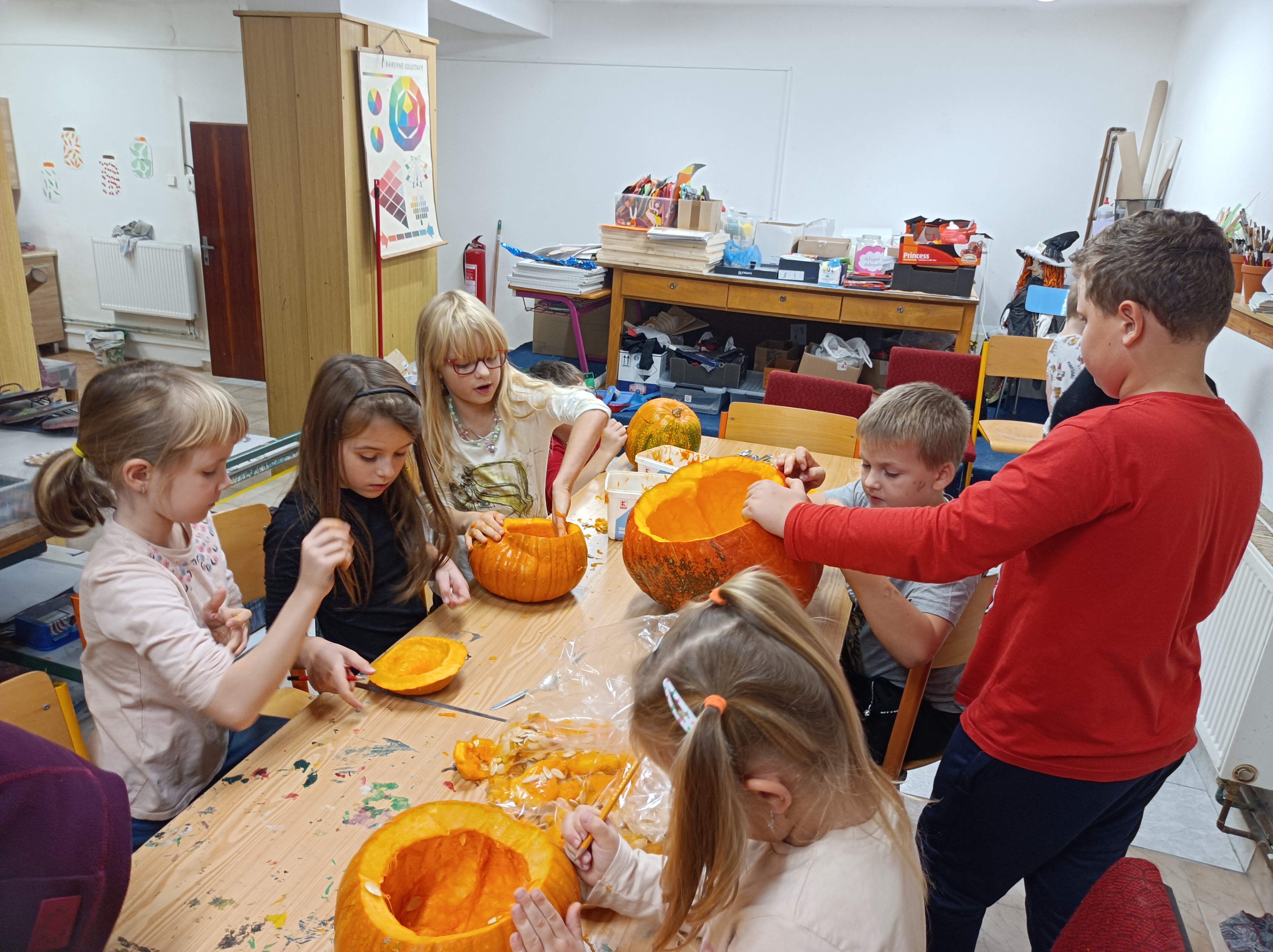 Minulý týden se nesl ve škole ve znamení Halloweenu a Dušiček a také paní vychovatelky připravily pro děti na páteční odpoledne akci, na kterou se všechny děti několik dní předem těšily – dýňování. Z menších dýní různých velikostí, barev a tvarů si děti vyrobily dýňová strašidýlka a velké dýně pečlivě vydlabávaly, zdobily a rozsvítily. Malá strašidýlka si děti hrdě odnesly domů, velké rozsvícené dýně zdobí přední i zadní vstup do školy. Bohužel, povedly se nám natolik, že některý místní chmaták neváhal a několik dýní během první hodiny odcizil. Kdyby si vyrobil své vlastní, měl by z nich jistě větší radost. No a pokud si je doma vyrobit a obstarat neumí, tak ať příští rok dorazí na naše dýňování – užije si tam s námi i spoustu legrace.