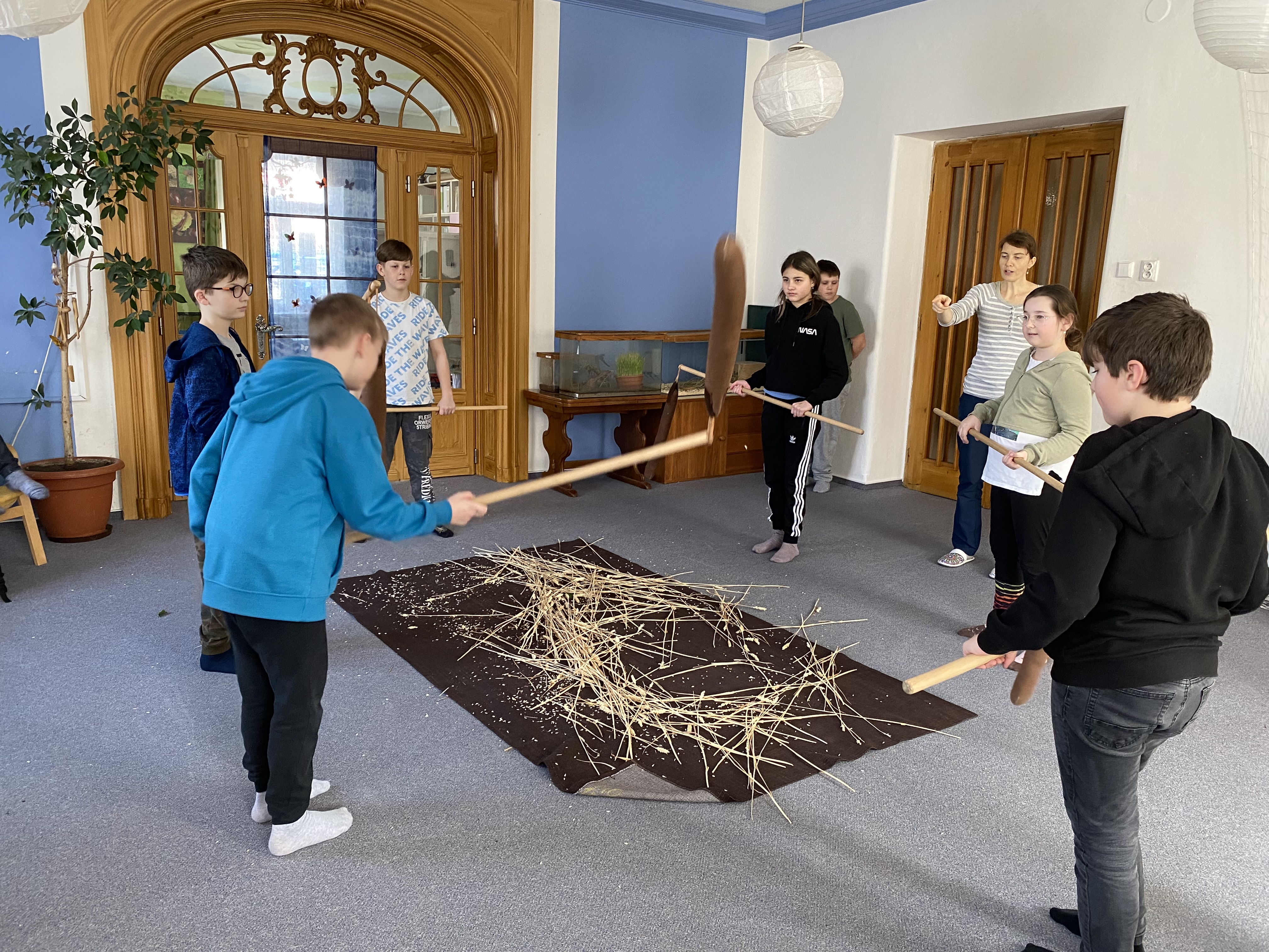 Žáci se dozvěděli spoustu nových informací, které si mohli vyzkoušet prakticky – například mlácení obilí,